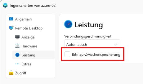 Diese Bitmap-Zwischenspeicherung können Sie in den Eigenschaften der RDP-Verbindung deaktivieren, indem Sie folgenden Haken entfernen: