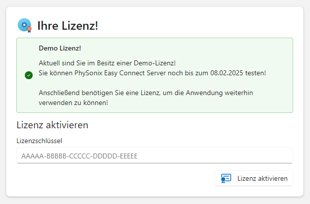 Sie können den Lizenzschlüssel auch leer lassen, dann wird automatisch eine eingeschränkte Demo-Lizenz verwendet.