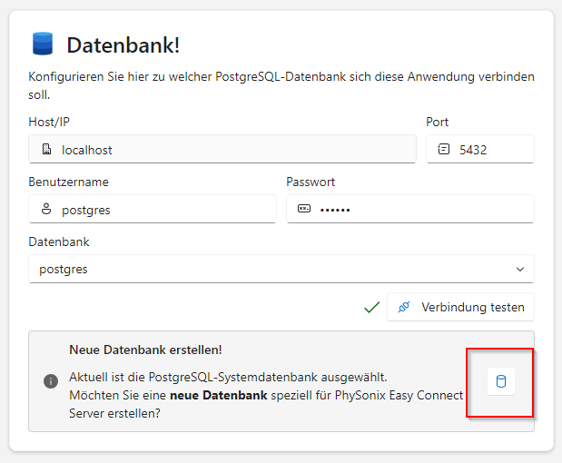Wenn es noch keine Datenbank für Easy Connect auf diesem PostgreSQL Server gibt, können Sie die Systemdatenbank postgres auswählen, und über den markierten Button eine neue Datenbank erstellen.
