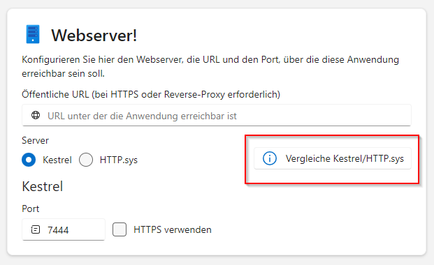 Im nächsten Schritt konfigurieren Sie den Webserver. Zur Auswahl stehen die Webserver Kestrel oder HTTP.sys. Einen übersichtlichen Vergleich der beiden Webserver finden Sie über den markierten Button.