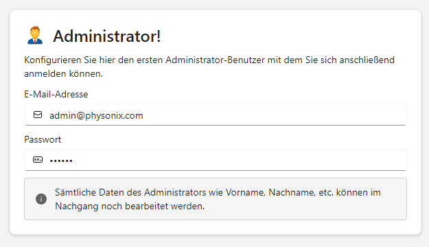 Im vorletzten Schritt konfigurieren Sie den ersten Administrator-Benutzer, mit dem Sie sich anmelden können.