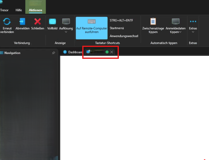 Manchmal kommt es vor, dass eine RDP-Verbindung augenscheinlich ganz normal startet (Grüner Punkt ist da), der sie bleibt aber komplett Weiß.